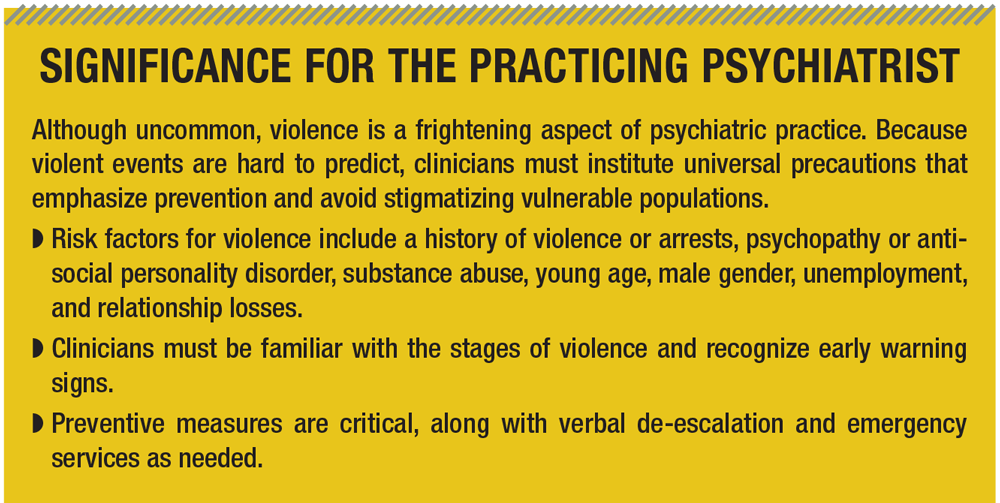 The risk of violence in psychiatric practice is a frightening aspect of our work. Violent events are uncommon and hard to predict, and clinicians must guard against complacency and institute universal precautions that emphasize prevention. Patients with mental illness are at high risk for violent victimization, and preventive measures should not stigmatize a vulnerable population. Team members must work together to optimize safety, using evidence and experience to ensure excellent patient care.