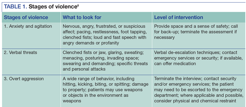 Early recognition of agitation is crucial to preventing or avoiding escalating behavior problems. Table 1 outlines the stages of violence and the levels of intervention required. Noticing early warning signs such as pacing and frustrated affect can avoid danger and allows an opportunity to help patients feel safe and stay in control.