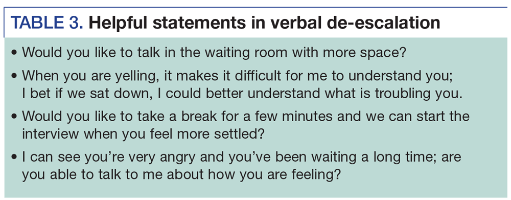 Common mistakes in verbal de-escalation include arguing or taking the emotional state personally. Instructing a patient to “calm down” or falsely threatening to call security or police is generally unhelpful and can increase the acuity of the situation. Table 3 highlights some practical statements that can be used in verbal de-escalation.