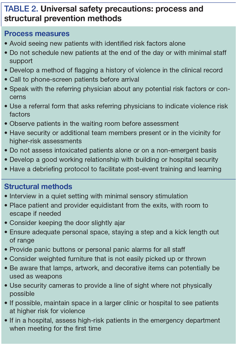 A workplace violence survey highlighted the need for multidisciplinary team safety training and the value of standardized protocols for post-incident debriefing and processing. 7 Mandating routine crisis intervention and safety training for all team members will underscore the importance of violence prevention from an organizational perspective. For worst-case scenarios, teams must be well-acquainted with local safety and security protocols, including calling for emergency services through a “code white” or 911 call. Physicians who work in an independent location may benefit from a security consultation through a local provider.